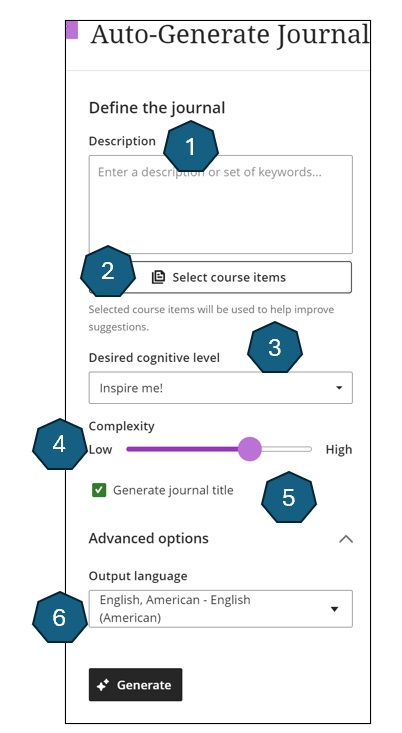 - Auto-generate a journal. If your institution uses the AI Design Assistant feature, you can use AI to create a journal. Select the Auto-Generate Journal button to bring up the creation panel.