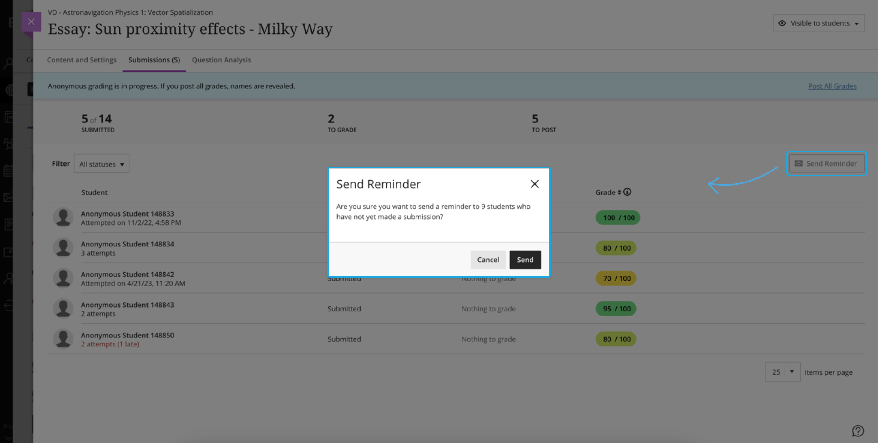You can send a reminder to students who have not submitted even while anonymous grading is in place. To send a reminder, go to the Submissions list for the assignment and click the Send Reminder button. [view screenshot]